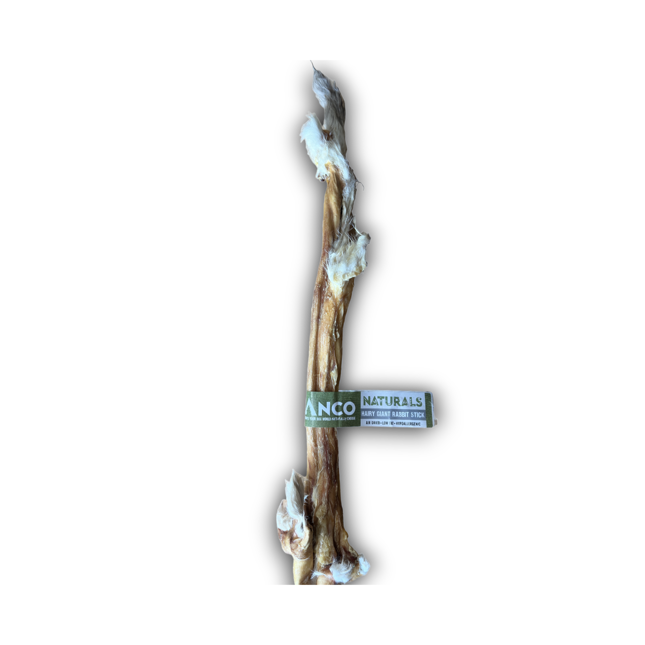 Anco Naturals Hairy Giant Rabbit Stick is a long-lasting, durable chew made from 100% natural rabbit. Perfect for larger dogs and keen chewers, these hypoallergenic sticks are gentle on sensitive stomachs and dogs with food sensitivities.