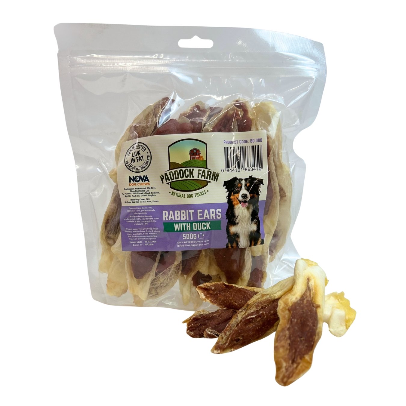 Duck 77%, rabbit ear 15%, potato starch, plant protein