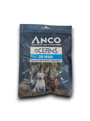 Introducing Anco Oceans Cod Braids - the perfect treat for your furry friend! Packed with Omega 3 and 6. These treats support eye and brain development, so your dog can impress all the other pups at the dog park with their intelligence and training ability.