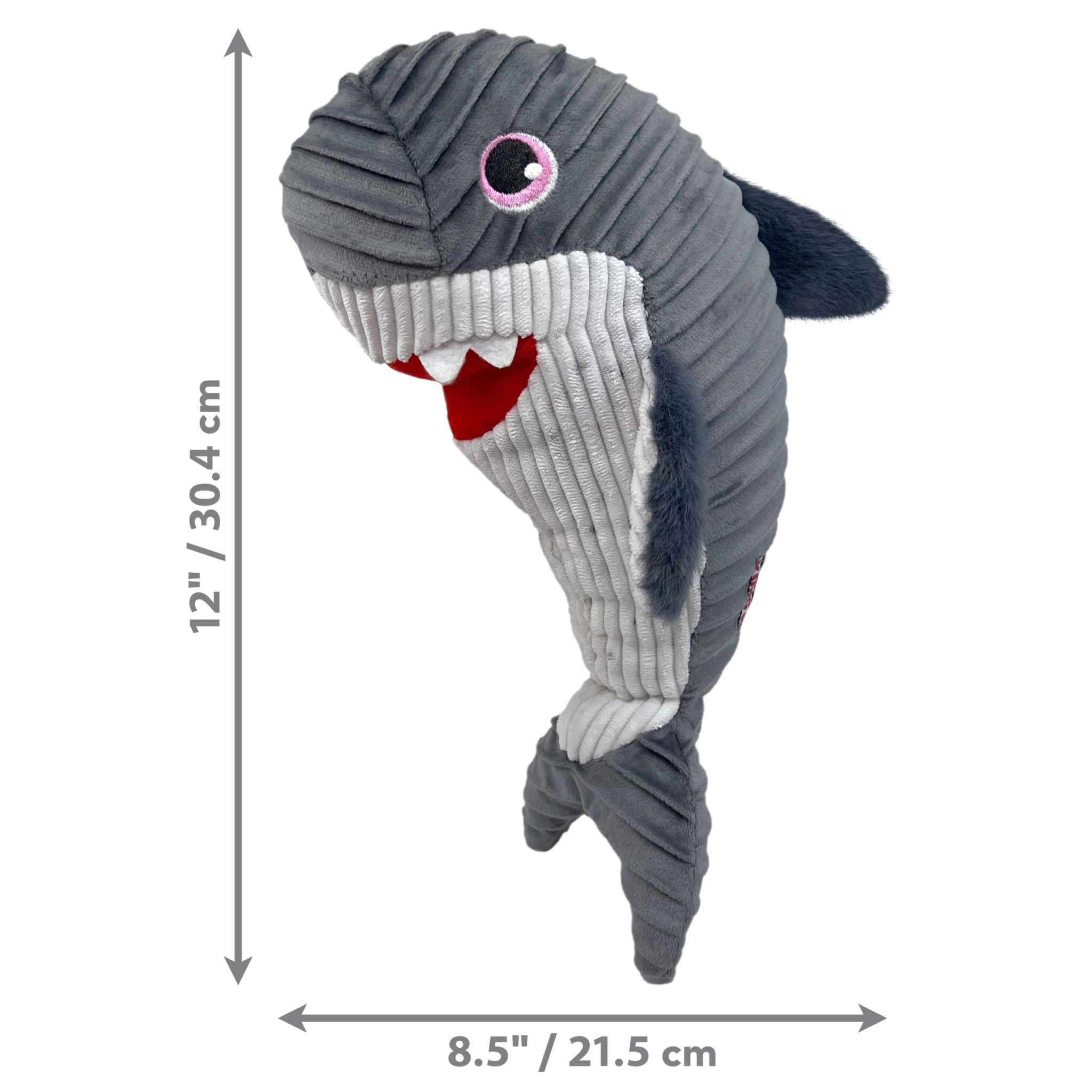 Gray shark-shaped plush toy with a red interior on a white background