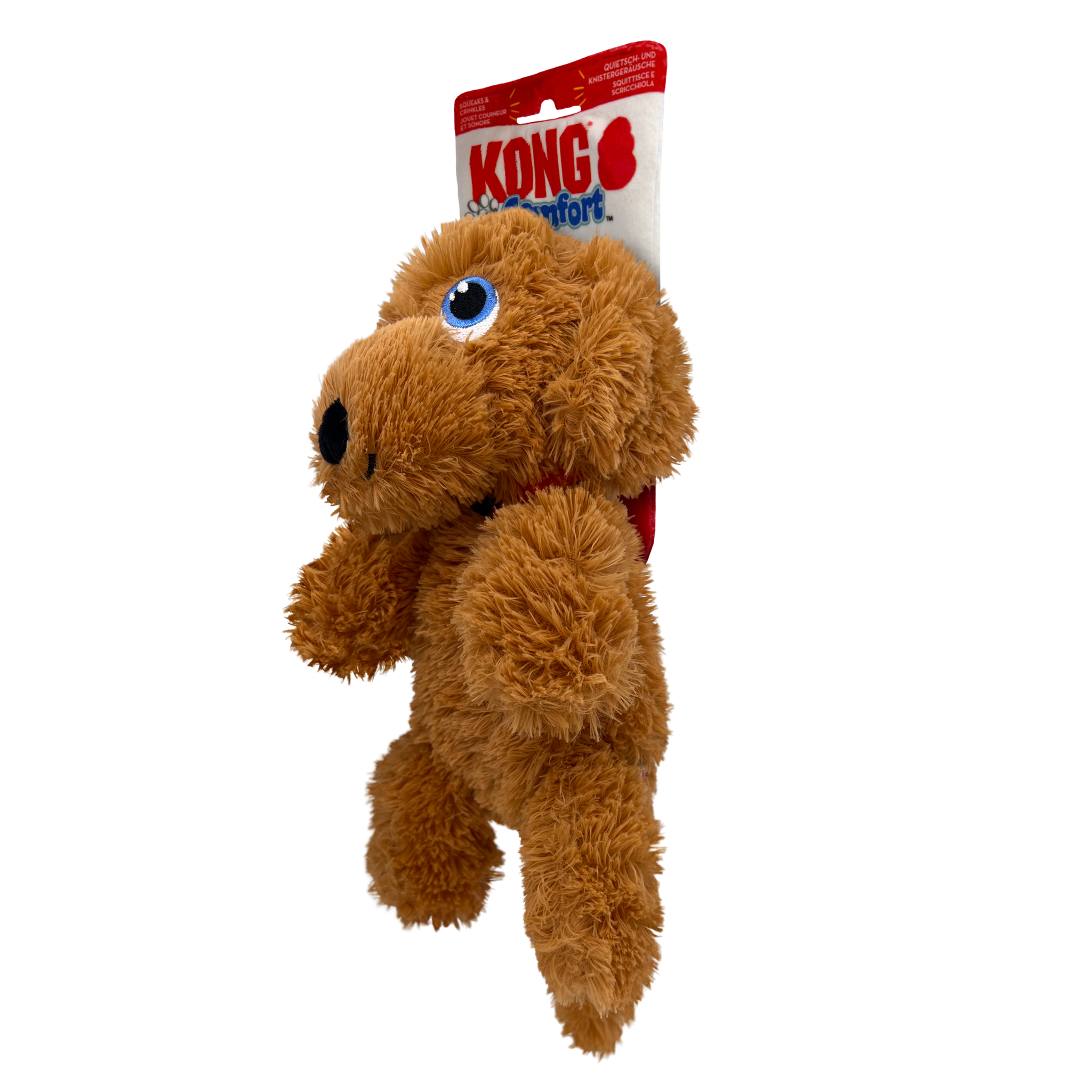 KONG Comfort Pups Goldie – Medium is a super-soft plush companion designed for cuddling and gentle games of fetch. With its fluffy fur and adorably floppy body, Goldie makes an ideal snuggle buddy while still encouraging interactive play.