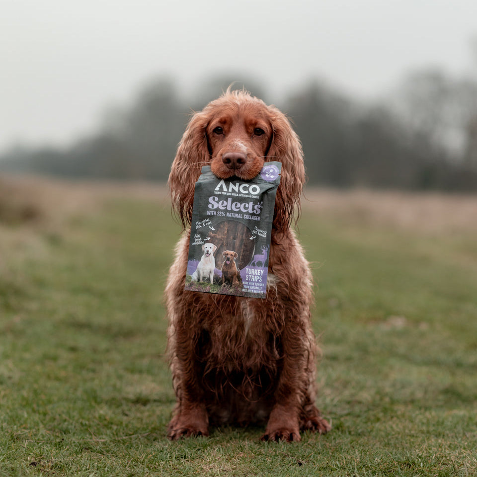 These Anco Selects treats combine the benefits of Collagen from naturally shed deer antlers with high quality Turkey protein to support your dog's health. Turkey is a lean, easily digestible protein, rich in essential amino acids that promote muscle growth and repair. It also provides natural sources of B vitamins, selenium and zinc, which support immune health, cellular function and energy levels. Our Collagen promotes joint flexibility, skin elasticity, a shiny coat and digestive wellness, enhancing mobility, gut health and overall vitality. Together, these ingredients can improve joint, skin, digestive and immune health, making Anco Selects an ideal choice to boost your dog's quality of life.